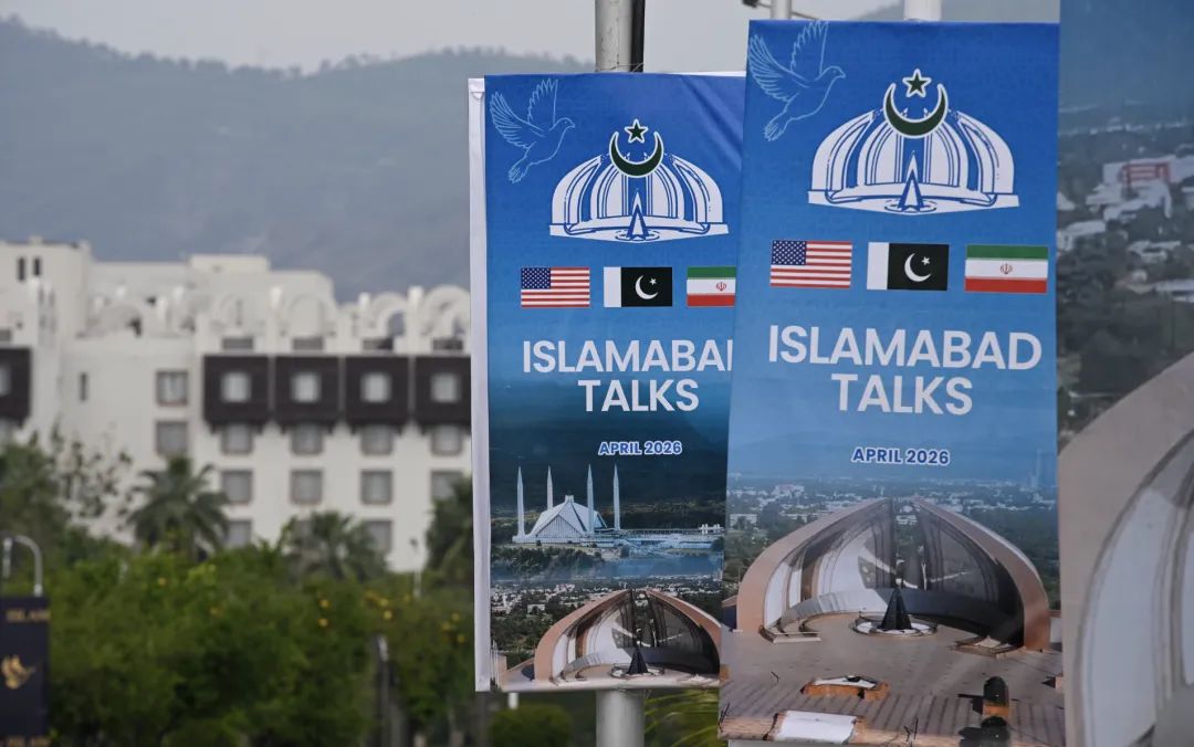 这是4月11日在巴基斯坦伊斯兰堡的美伊谈判新闻中心外拍摄的谈判相关海报。新华社发