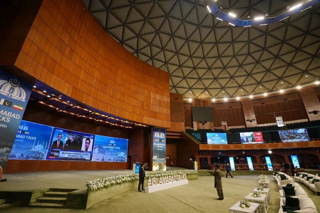 这是4月11日在巴基斯坦伊斯兰堡拍摄的美伊谈判新闻中心内部。新华社发