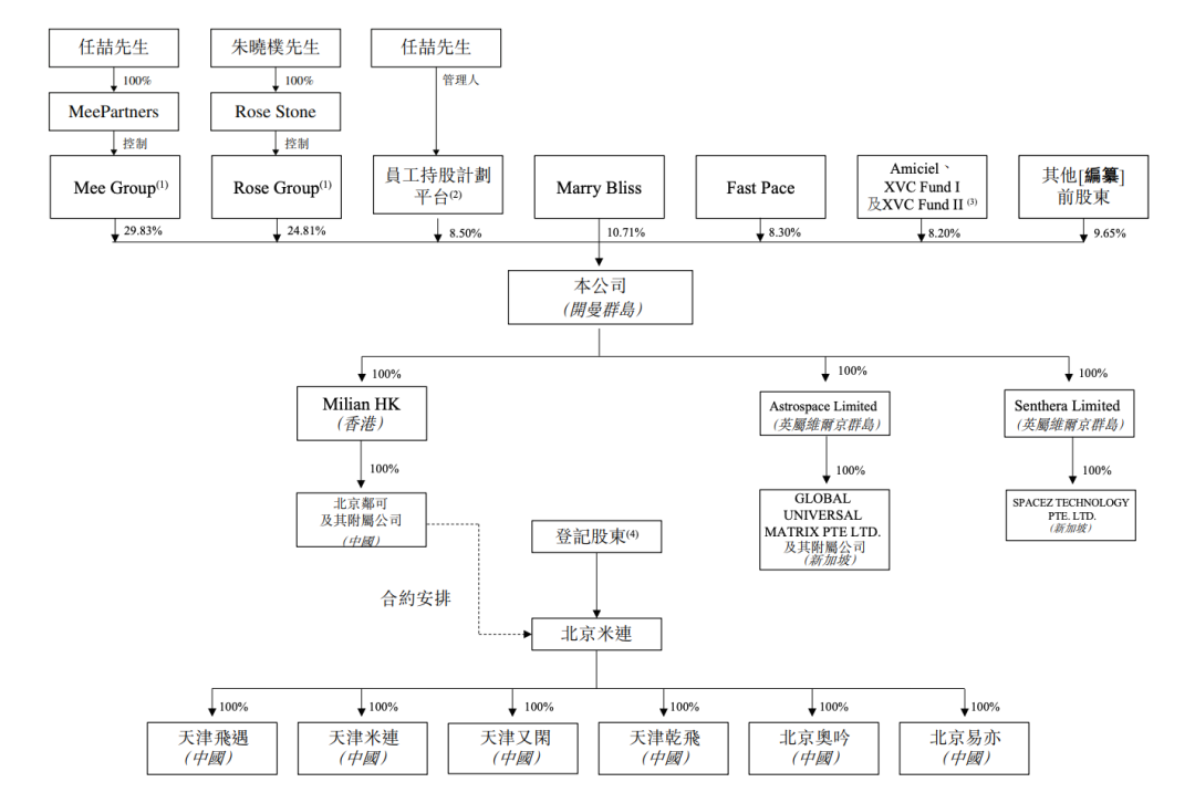 IPO前,任喆通过Mee Group持股为29.83%,朱晓朴通过Rose Group持股为24.81%,员工持股计划平台持股为8.5%,蓝驰创投通过Marry Bliss持股10.71%,小米集团通过Fast Pace持股为8.3%,XVC通过Amiciel、XVC Fund I及XVC Fund II持股为8.2%。