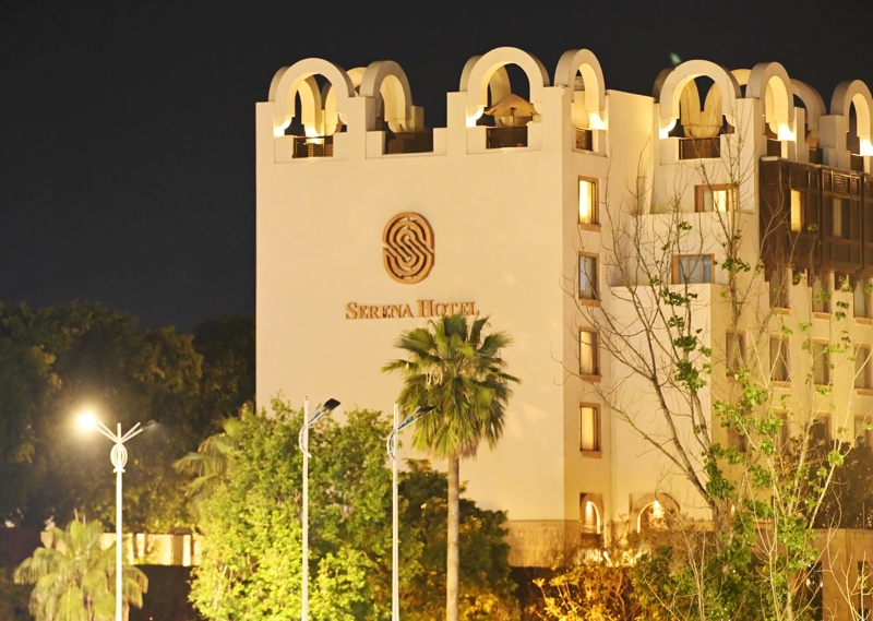 这是4月11日晚在巴基斯坦首都伊斯兰堡拍摄的塞雷纳酒店外景。