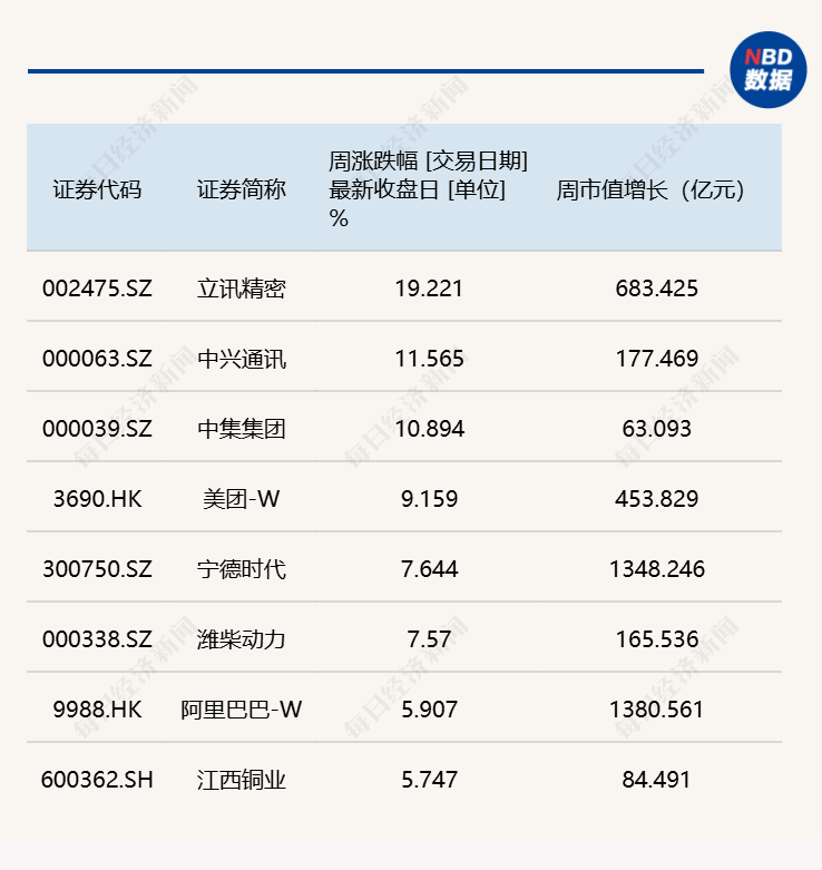 周市值增长方面,腾讯控股、阿里巴巴-W、宁德时代的周市值增长均超过1000亿元。