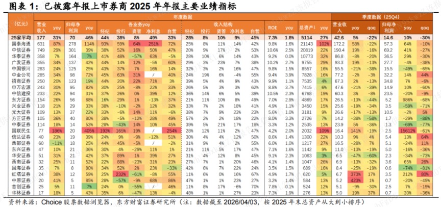 25年券商板块利润高增、ROE提升;1Q26市场交易额及两融余额维持高增,板块基本面继续改善。截至26/4/3收盘,板块静态PE/PB估值分别处于近十年4%/8%分位数,关注基本面持续改善与涨幅背离下的投资机会。