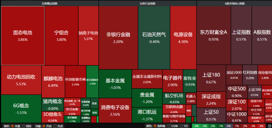 A股三大指数昨日集体上涨,沪指涨0.51%,深证成指涨2.24%,创业板指涨3.78%,创2021年12月以来的阶段新高。沪深京三市成交额超过2.3万亿。行业板块多数收涨,电池、玻璃玻纤、能源金属、证券、机器人、多元金融、电力设备板块涨幅居前,贵金属、航运港口板块跌幅居前。