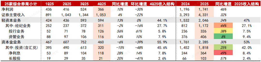 券商2025年业绩表现亮眼,各业务条线全面增长。此外,券商并购重组与国际布局成效显著,国联民生国泰海通业绩增速位列前两位,多家头部券商国际业务贡献再创新高我们认为,2025年业绩高增主要受益于市场回暖、交投活跃及一二级市场复苏。展望2026年,在政策持续支持下,行业有望迈向“头部机构做优做强、中小机构特色化发展”的新格局,建议关注证券板块长期价值。