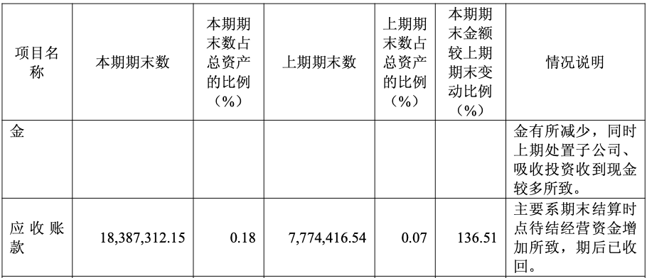 截至报告期末,公司应收账款18,387,312.15元,同比增加136.51%,主要系期末结算时点待结经营资金增加所致,期后已收回。