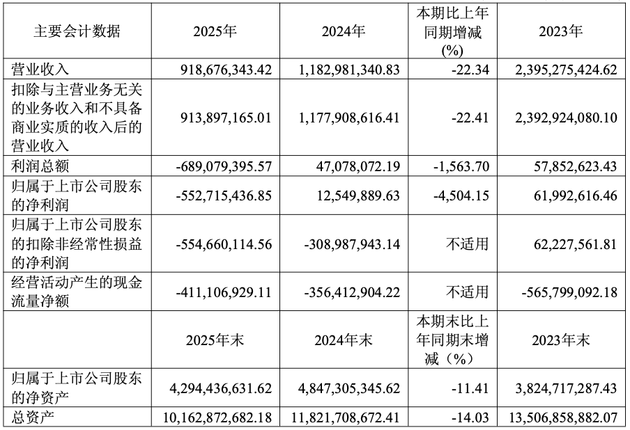 4月10日,西藏城投(600773)披露2025年年度报告。2025年,公司实现营业总收入9.19亿元,同比下降22.34%;归母净利润亏损5.53亿元,上年同期盈利1254.99万元;扣非净利润亏损5.55亿元,上年同期亏损3.09亿元;经营活动产生的现金流量净额为-4.11亿元,上年同期为-3.56亿元;报告期内,西藏城投基本每股收益为-0.58元,加权平均净资产收益率为-12.09%。