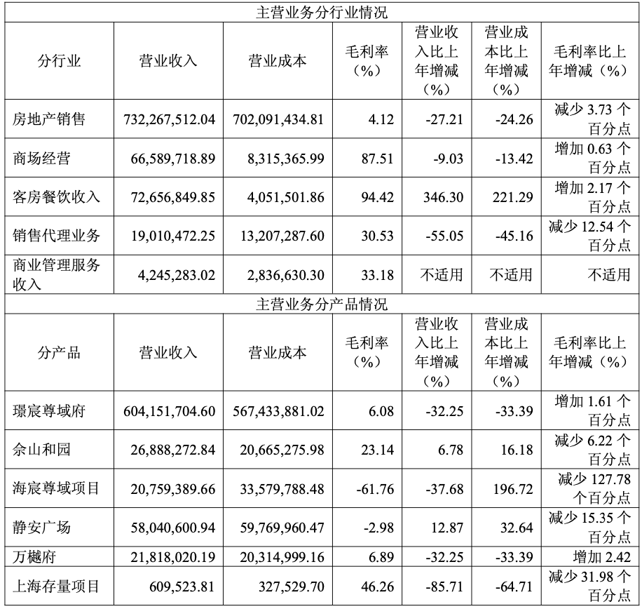 报告期内,公司实现房地产销售收入7.32亿元,较上年同比减少27.21%,毛利率4.12%,同比减少3.73个百分点。公司实现商场经营收入6658.97万元,同比减少9.03%,毛利率87.51%。酒店客房餐饮收入7265.68万元,同比增加346.30%,毛利率94.42%。