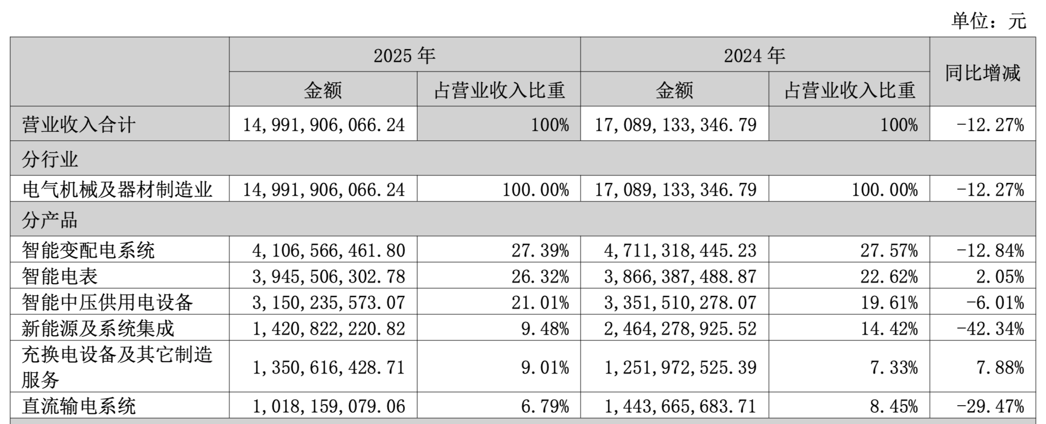 2025年,公司智能变配电系统、智能中压供用电设备、新能源及系统集成、直流输电系统的营收均出现不同程度的下滑,其中,占营收比重最大的智能变配电系统,营收下滑12.84%,新能源及系统集成营收下滑42.34%。