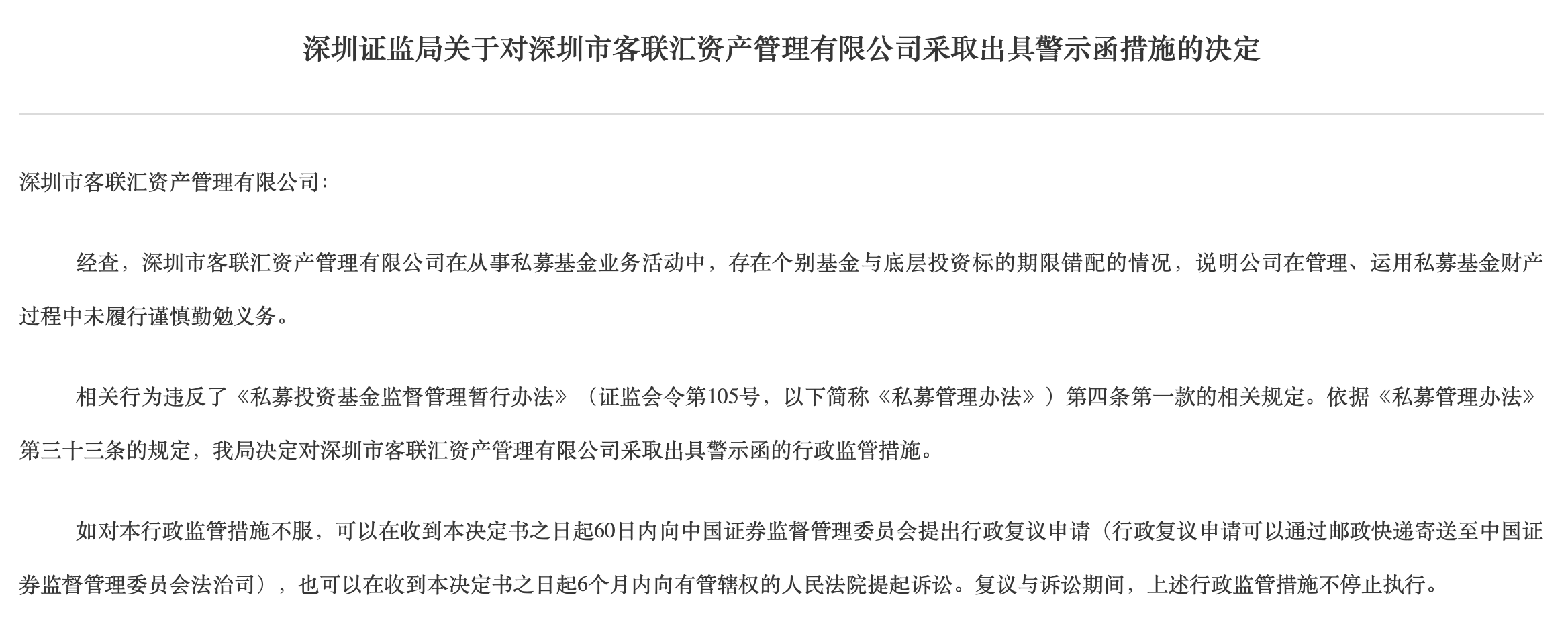 个别基金与底层投资标的期限错配,深圳客联汇资管收警示函