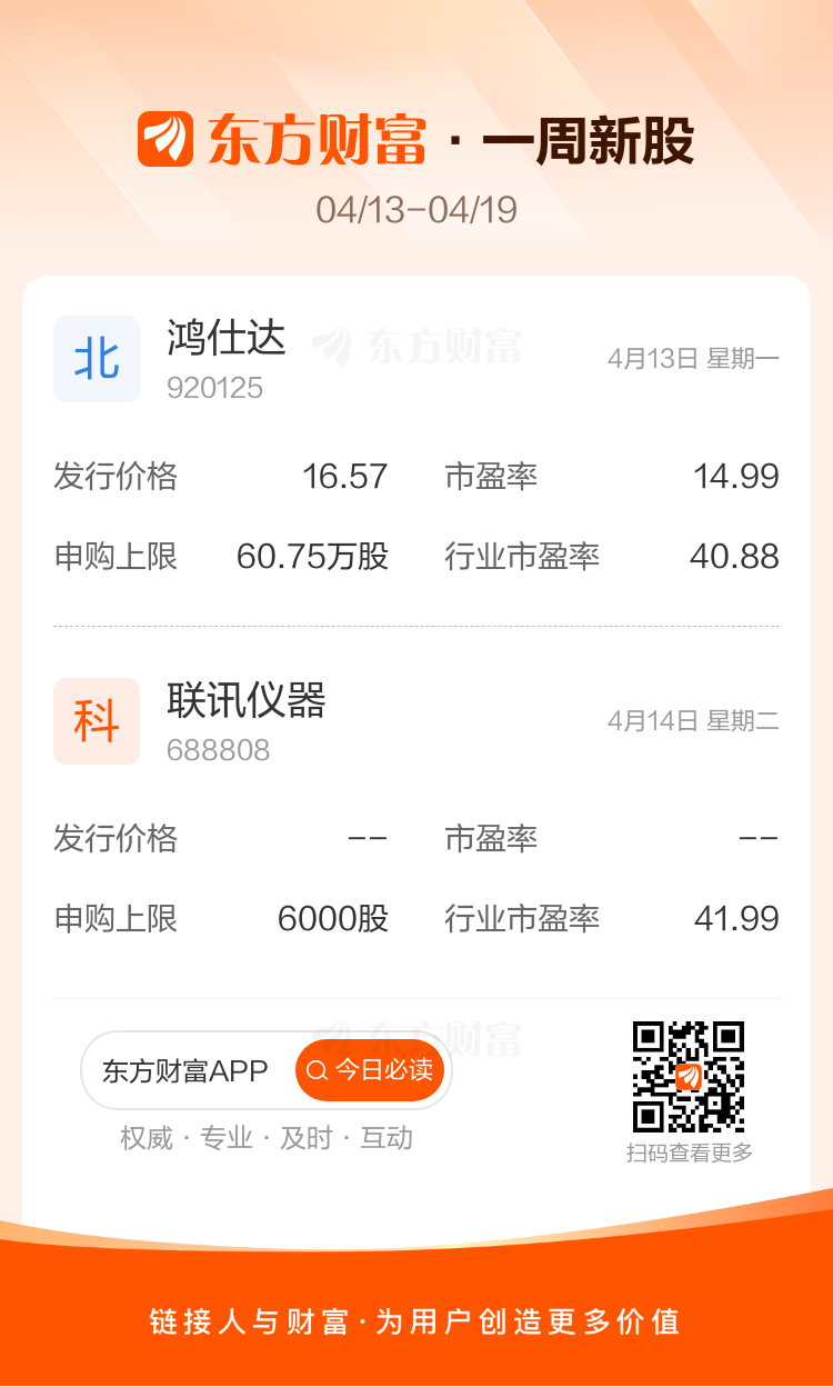 下周(4月13日至4月19日)沪深北三市有2只新股申购,分别为鸿仕达、联讯仪器。