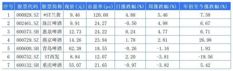 *ST兰黄以5.46%列啤酒股周涨幅第一