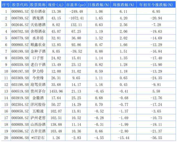 本周,啤酒A股4家上涨,*ST兰黄以5.46%领涨。威龙股份以7.08%领涨葡萄酒股,会稽山以3.67%领涨黄酒股。