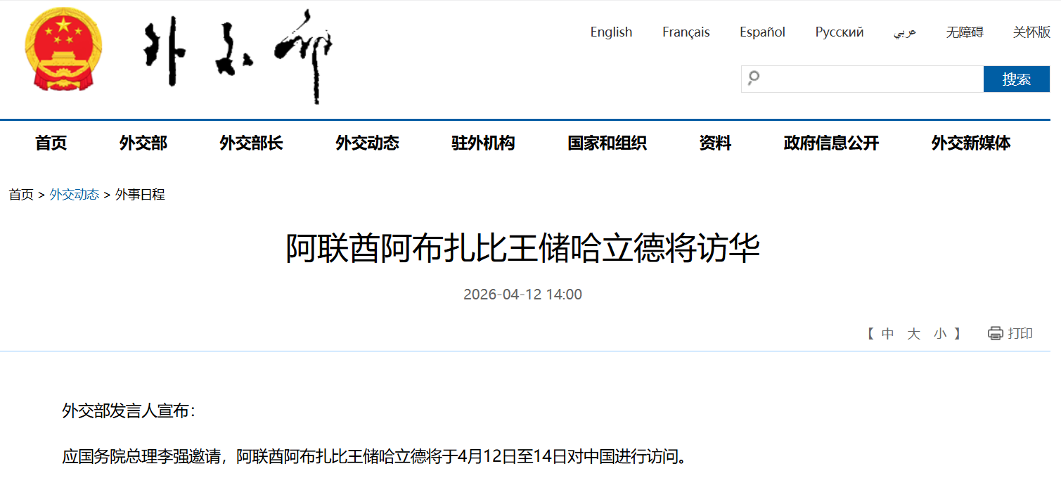 应国务院总理李强邀请,阿联酋阿布扎比王储哈立德将于4月12日至14日对中国进行访问。