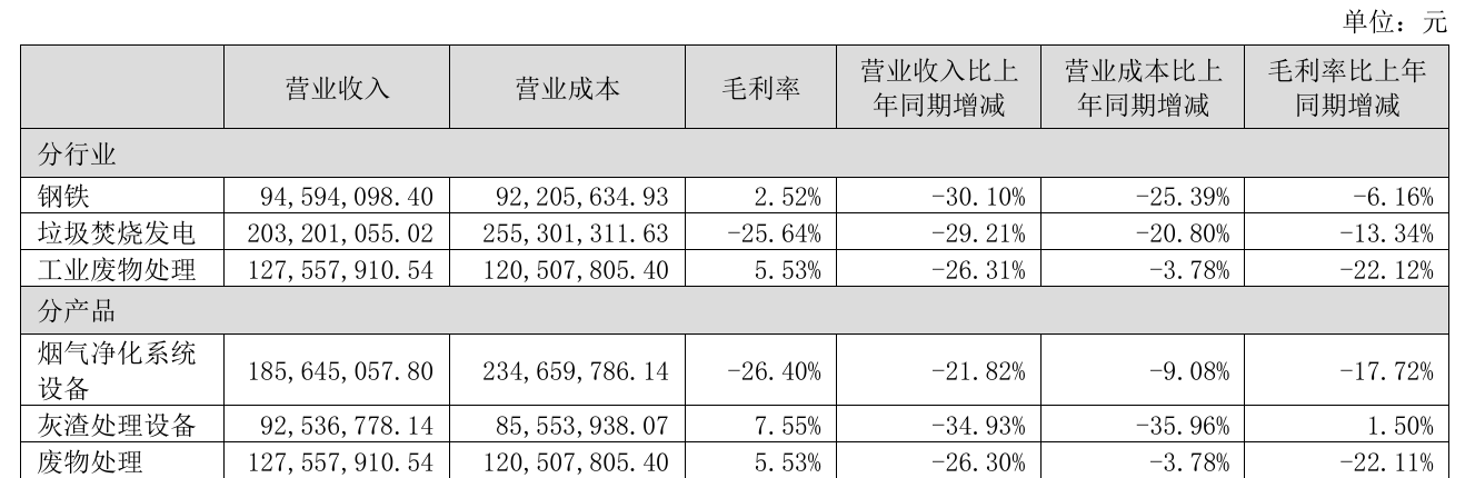 分拆产品来看,公司营收支柱烟气净化系统设备、废物处理双双沦陷。烟气净化系统设备营收占比43.38%,收入同比下滑21.82%,毛利率暴跌17.72个百分点至-26.40%;废物处理营收占比29.80%,收入同比下滑26.30%,毛利率同步减少22.11个百分点。