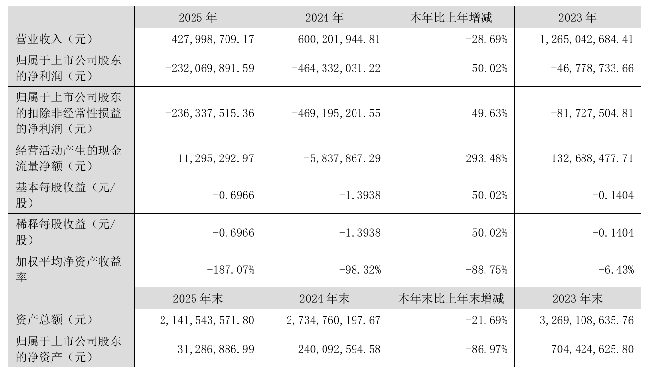 截至报告期末,公司母公司未分配利润为-5.59亿元,合并报表未分配利润为-6.59亿元。值得一提的是,中兴华会计师事务所(特殊普通合伙)对公司2025年年度财务报告出具了持续经营能力存在不确定性的无保留意见的审计报告。