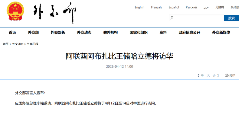 应国务院总理李强邀请,阿联酋阿布扎比王储哈立德将于4月12日至14日对中国进行访问。
