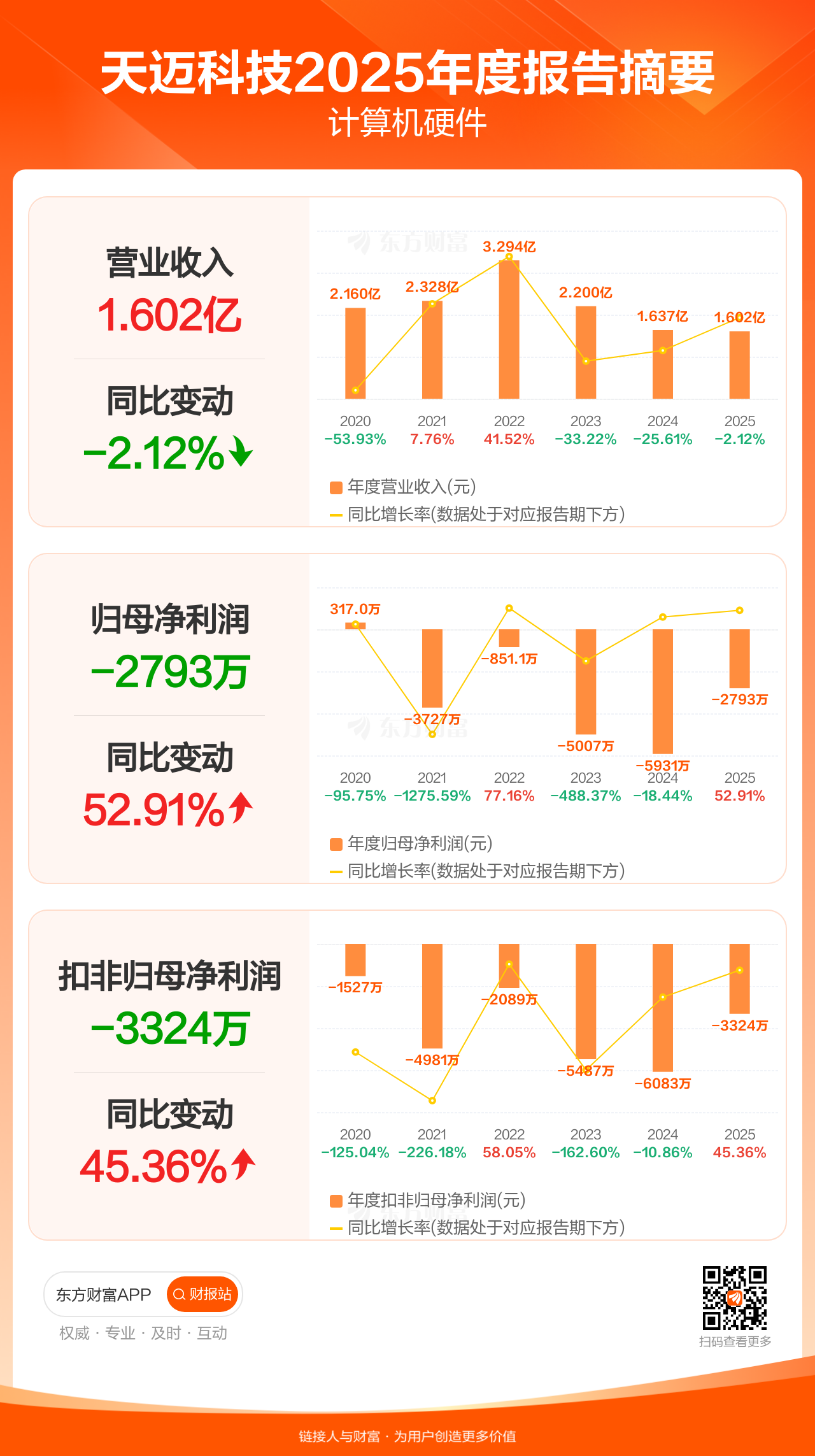 天迈科技4月13日发布2025年年报显示,公司全年实现营业收入1.60亿元,同比下滑2.12%;归母净利润-2793.01万元;扣非归母净利润-3323.70万元。