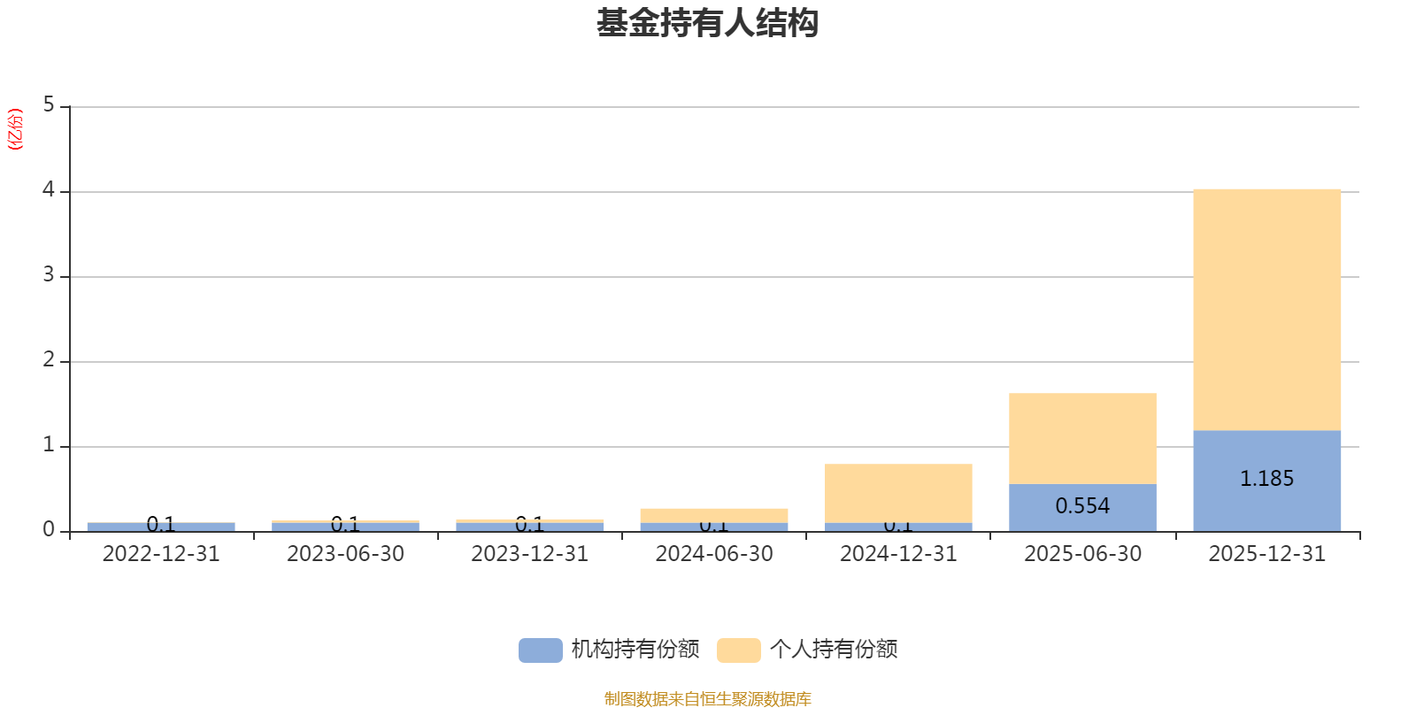 截至2025年12月31日,基金持有人共计3.94万户,合计持有4.02亿份。其中管理人员工持有26.6万份,占比0.07%,机构持有份额占比29.45%,个人投资者占比70.55%。