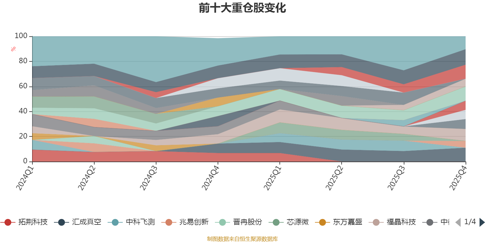 该基金持股集中度较高,近2年前十大重仓股集中度长期超过60%。截至2025年末,基金十大重仓股分别是中芯国际、茂莱光学、奥普光电、汇成真空、福晶科技、江波龙、德明利、寒武纪、燕东微、兆易创新。