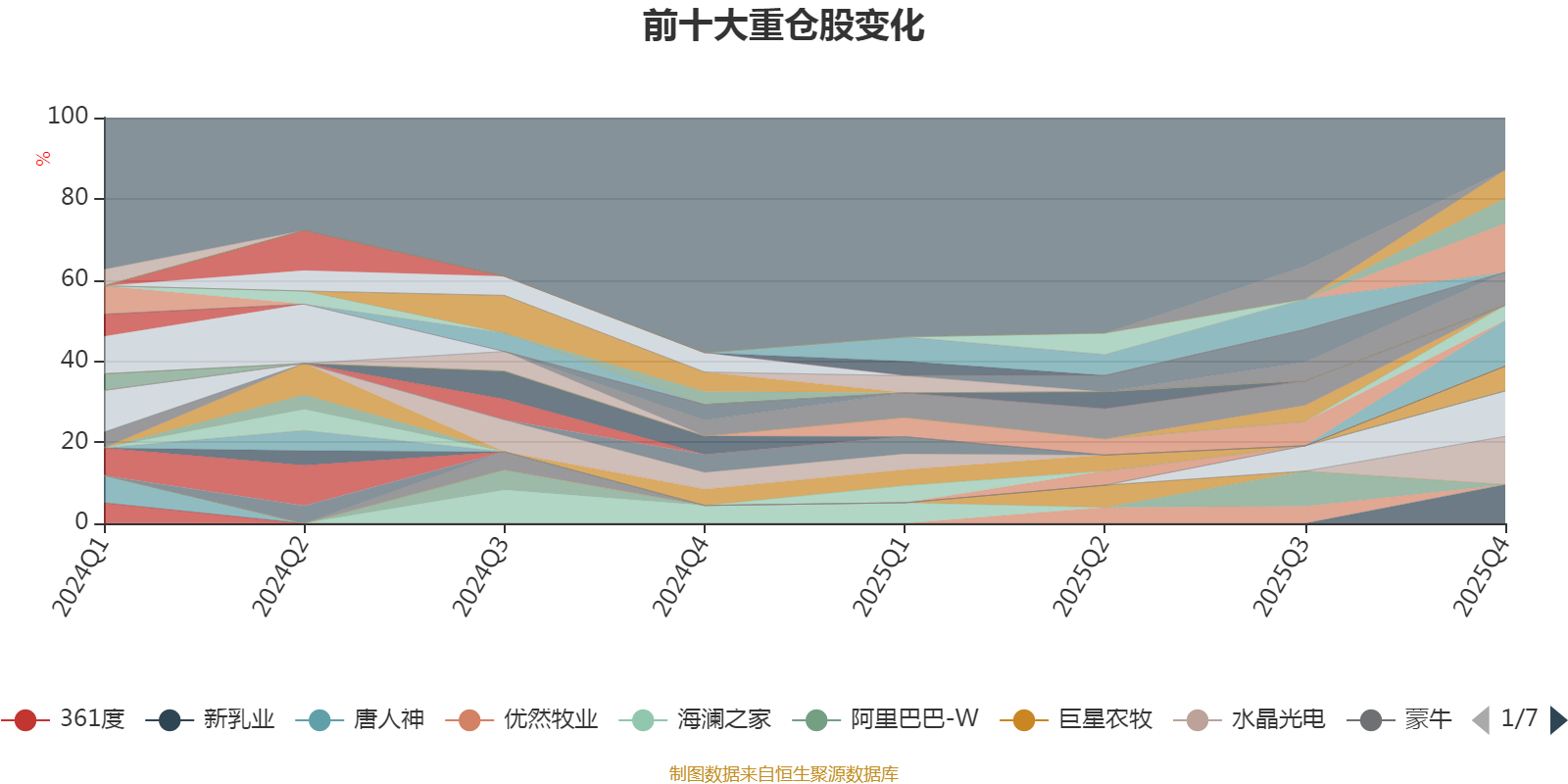 截至2025年末,基金十大重仓股分别是泡泡玛特、水晶光电、九号公司、毛戈平、新乳业、腾讯控股、老铺黄金、中际旭创、西麦食品、新澳股份。