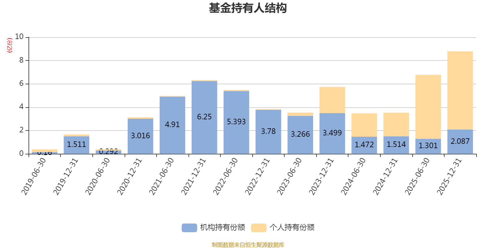 截至2025年12月31日,基金持有人共计5.65万户,合计持有8.79亿份。其中管理人员工持有177.52万份,占比0.20%,机构持有份额占比23.74%,个人投资者占比76.26%。
