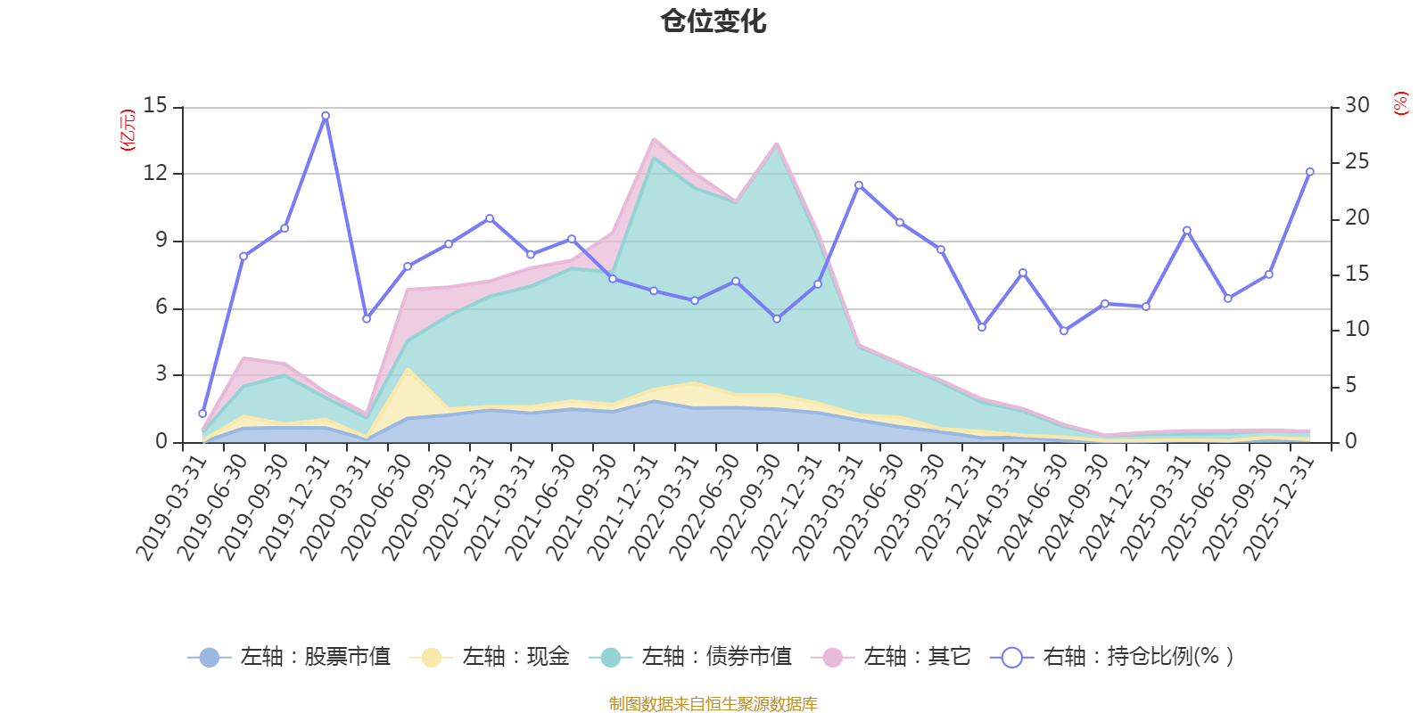 据定期报告数据统计,近三年平均股票仓位为15.92%,同类平均为19.2%。2019年末基金达到29.23%的最高仓位,2019年一季度末最低,为2.59%。