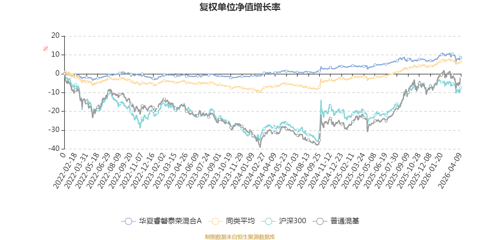 截至4月9日,华夏睿磐泰荣混合A近三个月复权单位净值增长率为-0.50%,位于同类可比基金449/629;近半年复权单位净值增长率为1.38%,位于同类可比基金263/629;近一年复权单位净值增长率为5.72%,位于同类可比基金404/629;近三年复权单位净值增长率为9.41%,位于同类可比基金340/581。