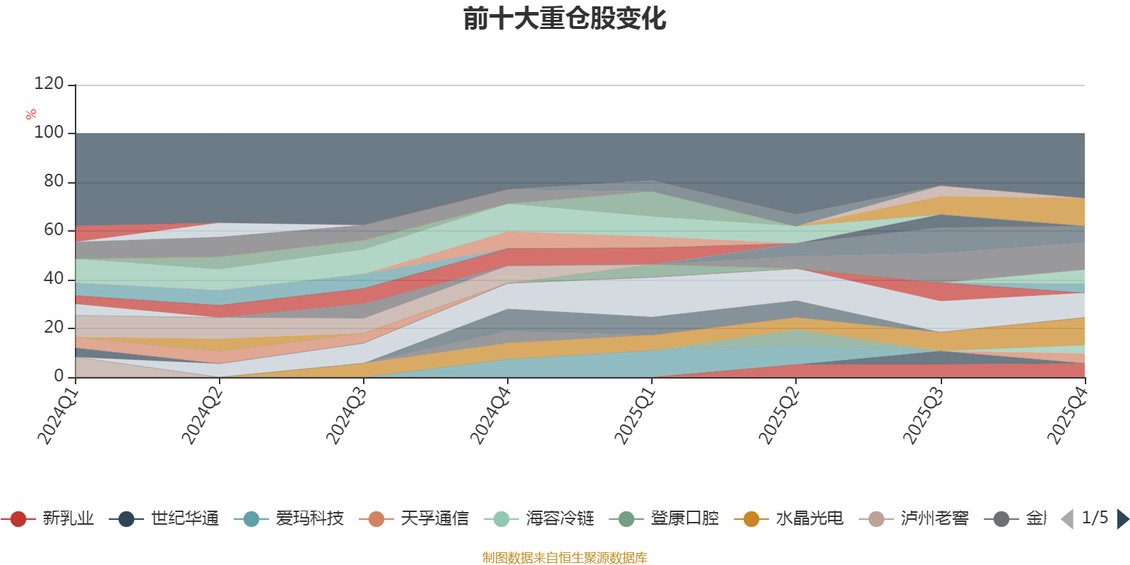 该基金持股集中度较高,近2年前十大重仓股集中度长期超过60%。截至2025年末,基金十大重仓股分别是中际旭创、水晶光电、新易盛、九号公司、渝农商行、中国平安、新乳业、天孚通信、西麦食品、海容冷链。