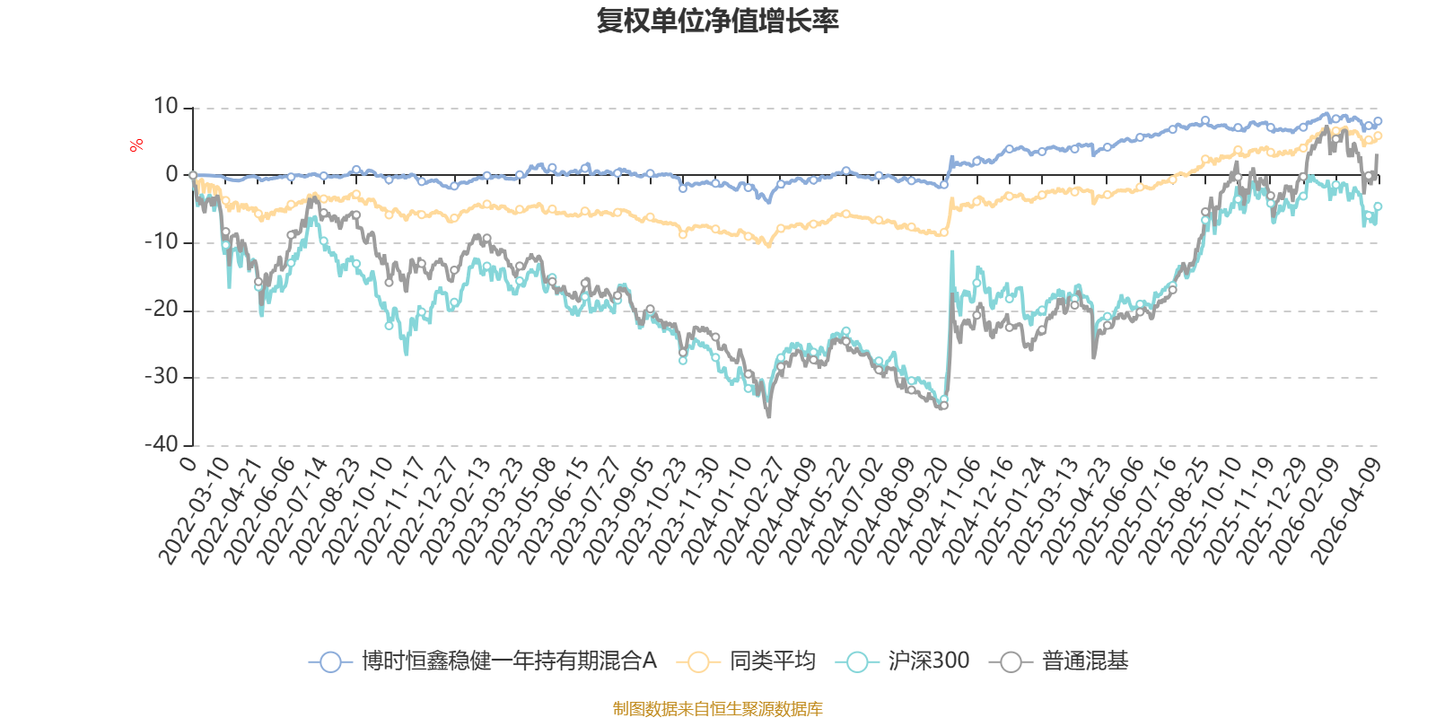 截至4月9日,博时恒鑫稳健一年持有期混合A近三个月复权单位净值增长率为0.17%,位于同类可比基金313/629;近半年复权单位净值增长率为0.46%,位于同类可比基金398/629;近一年复权单位净值增长率为4.60%,位于同类可比基金474/629;近三年复权单位净值增长率为6.45%,位于同类可比基金434/581。