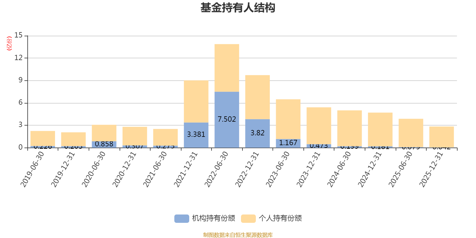截至2025年12月31日,基金持有人共计7.24万户,合计持有2.84亿份。其中管理人员工持有20.98万份,占比0.07%,机构持有份额占比1.49%,个人投资者占比98.51%。