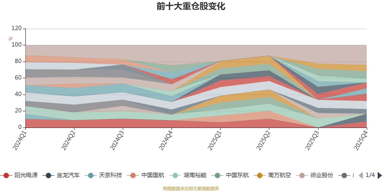 该基金持股集中度较高,近2年前十大重仓股集中度长期超过60%。截至2025年末,基金十大重仓股分别是宁德时代、金龙汽车、通威股份、欣旺达、晶科能源、阳光电源、天合光能、亿纬锂能、晶澳科技、阿特斯。