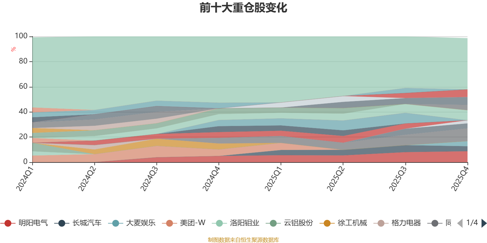 截至2025年末,基金十大重仓股分别是同程旅行、明阳电气、特步国际、赤峰黄金、华鲁恒升、中国铝业、大麦娱乐、长城汽车、哔哩哔哩-W、赣锋锂业。