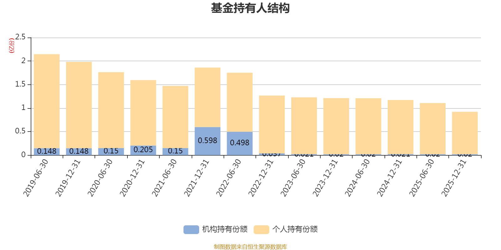 截至2025年12月31日,基金持有人共计9301户,合计持有9219.85万份。其中管理人员工持有30.81万份,占比0.33%,机构持有份额占比2.15%,个人投资者占比97.85%。