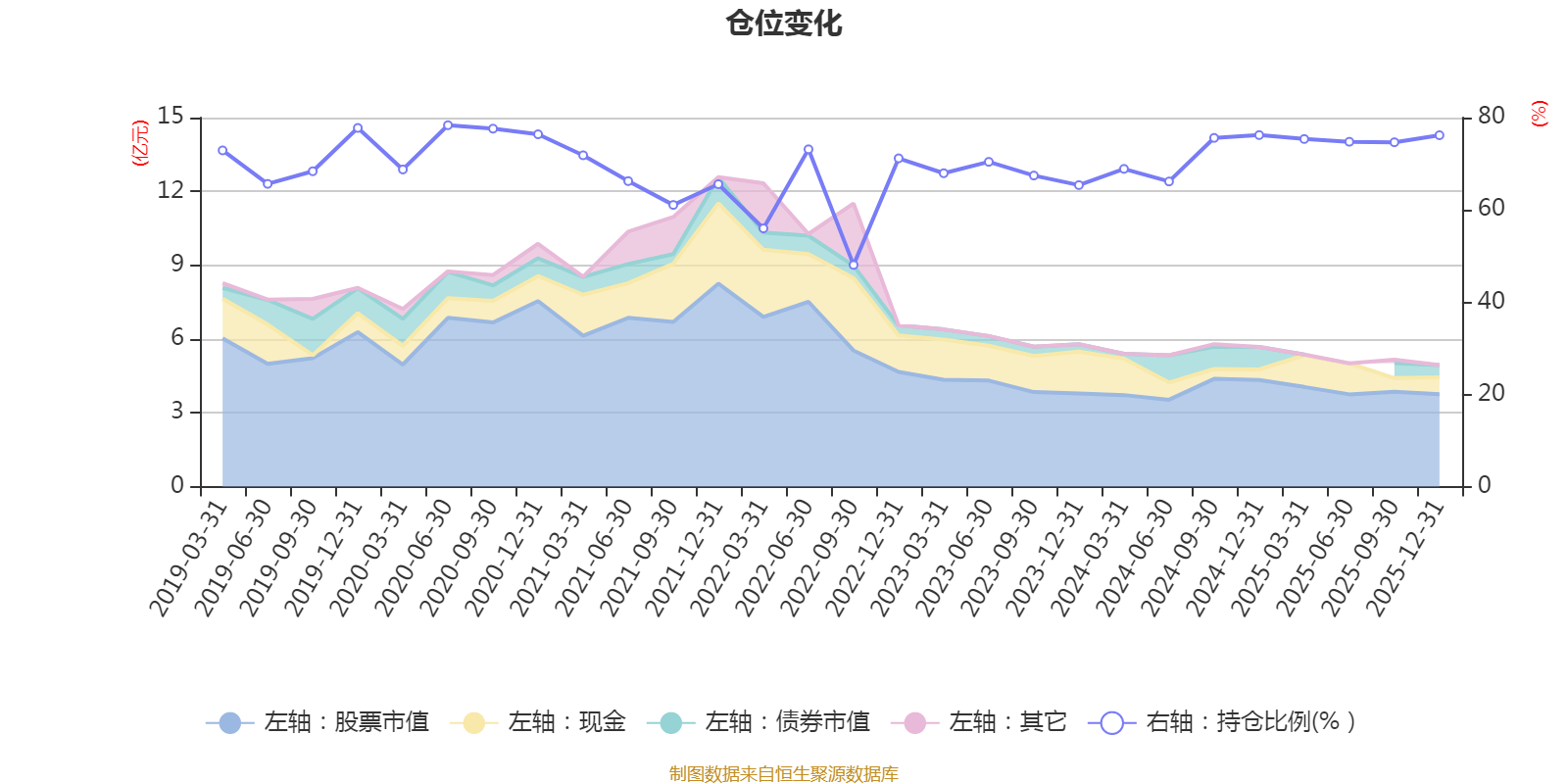据定期报告数据统计,近三年平均股票仓位为71.58%,同类平均为72.57%。2020年上半年末基金达到78.35%的最高仓位,2022年三季度末最低,为48.05%。