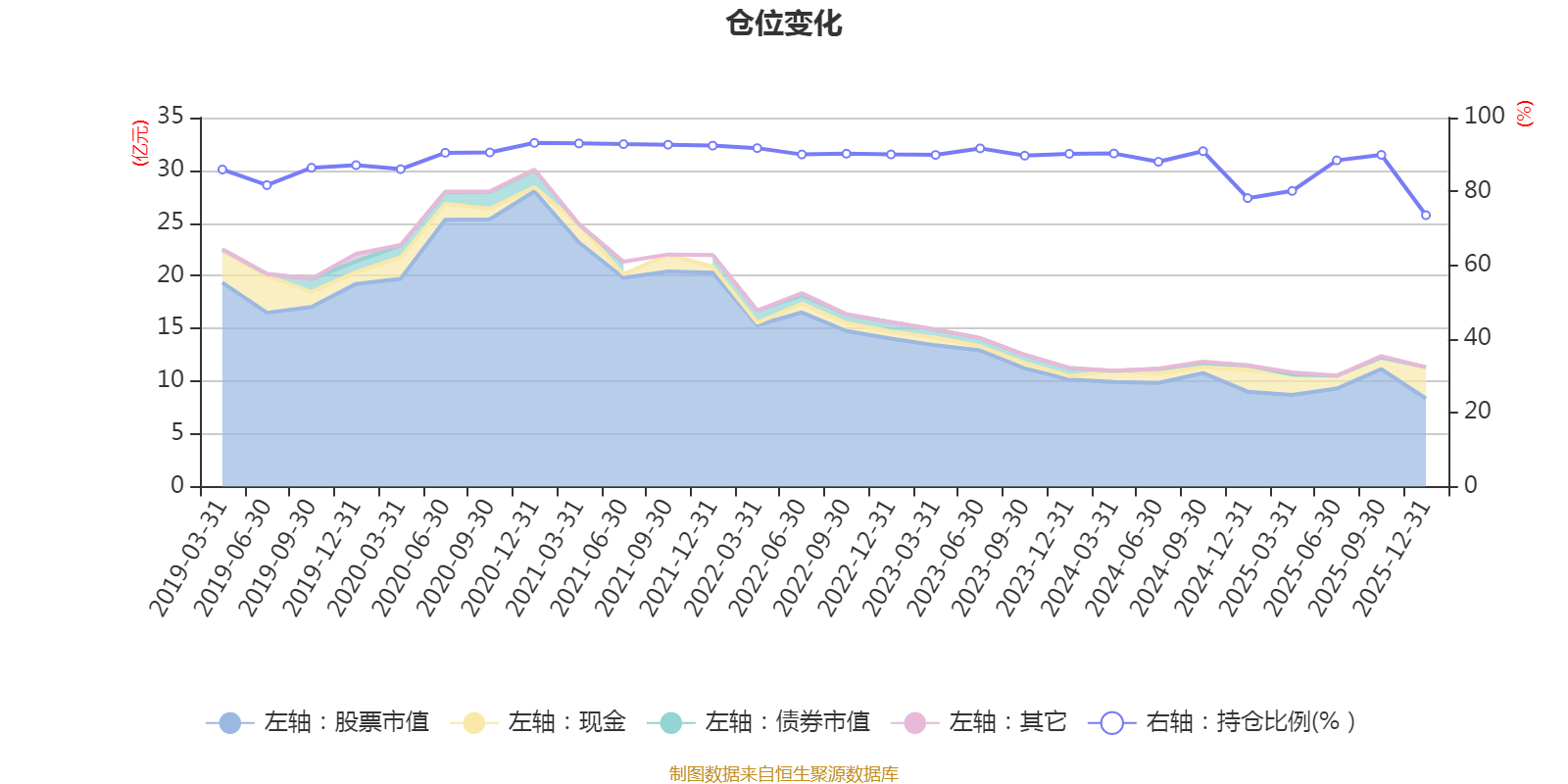 据定期报告数据统计,近三年平均股票仓位为86.73%,同类平均为87.64%。2020年末基金达到93.14%的最高仓位,2025年末最低,为73.56%。