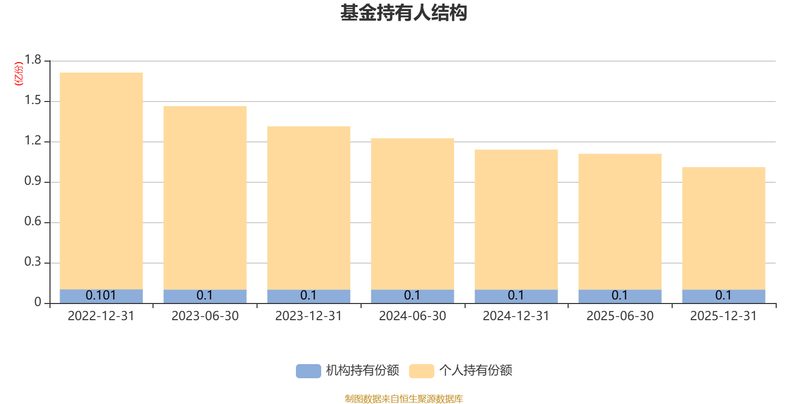 截至2025年12月31日,基金持有人共计1892户,合计持有1.01亿份。其中管理人员工持有11.69万份,占比0.12%,机构持有份额占比9.91%,个人投资者占比90.09%。