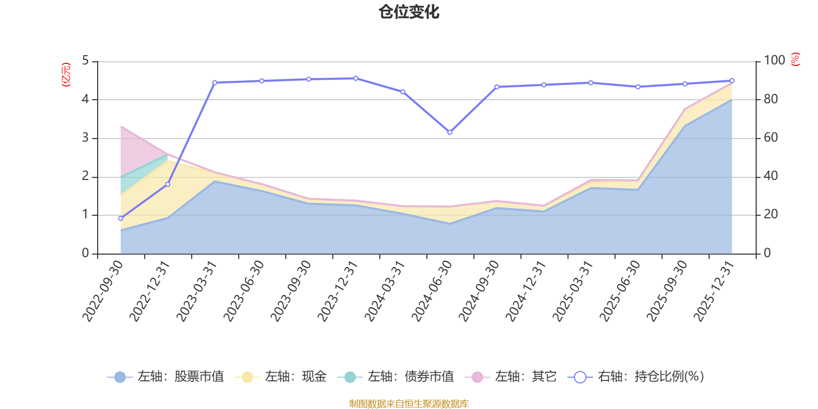据定期报告数据统计,近三年平均股票仓位为86.38%,同类平均为87.26%。2023年末基金达到91.2%的最高仓位,2022年三季度末最低,为18.46%。