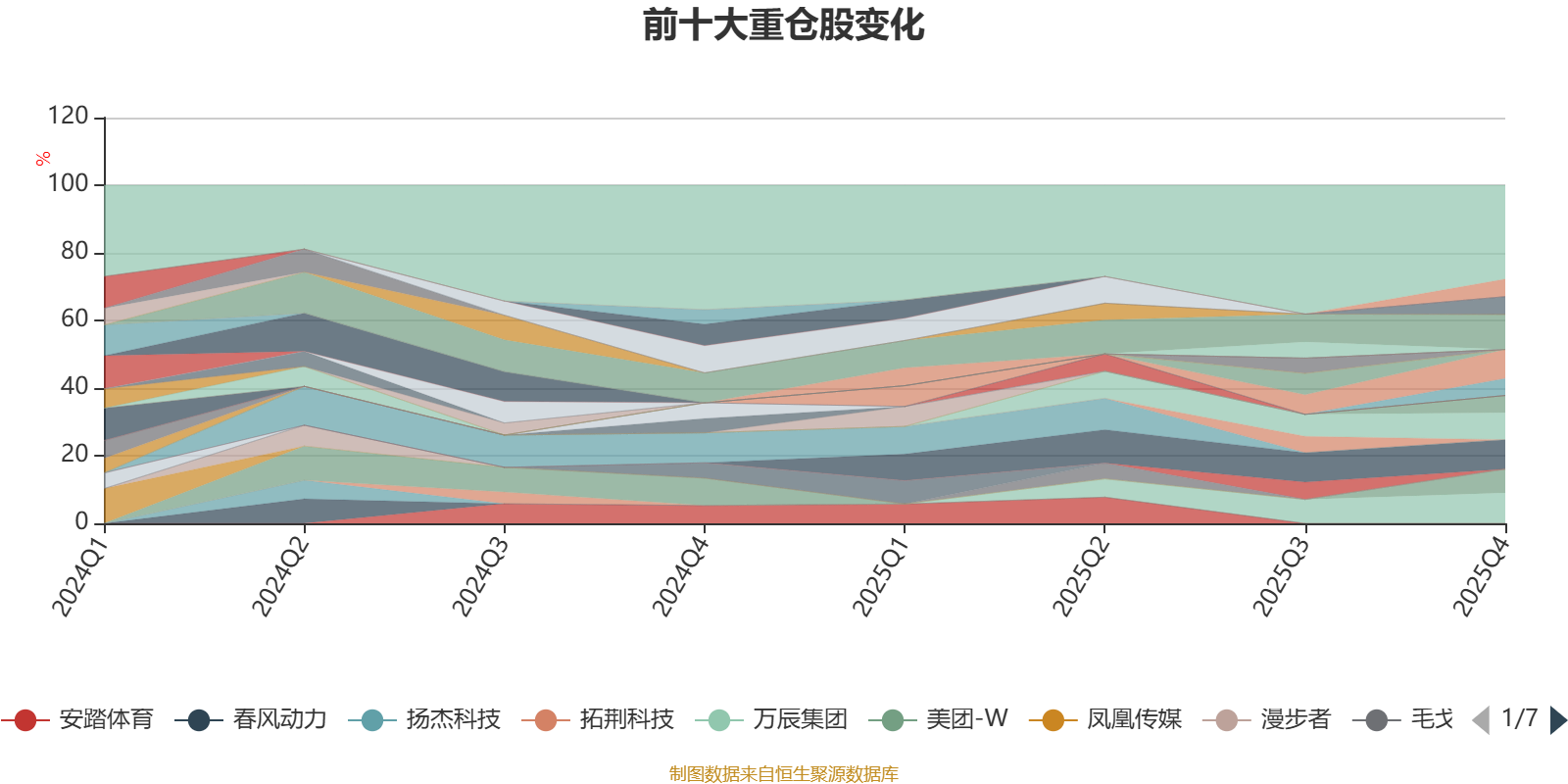 该基金持股集中度较高,近2年前十大重仓股集中度长期超过60%。截至2025年末,基金十大重仓股分别是贵州茅台、万辰集团、泸州老窖、山西汾酒、贝壳-W、美团-W、海尔智家、中国中免、金徽酒、锦江酒店。
