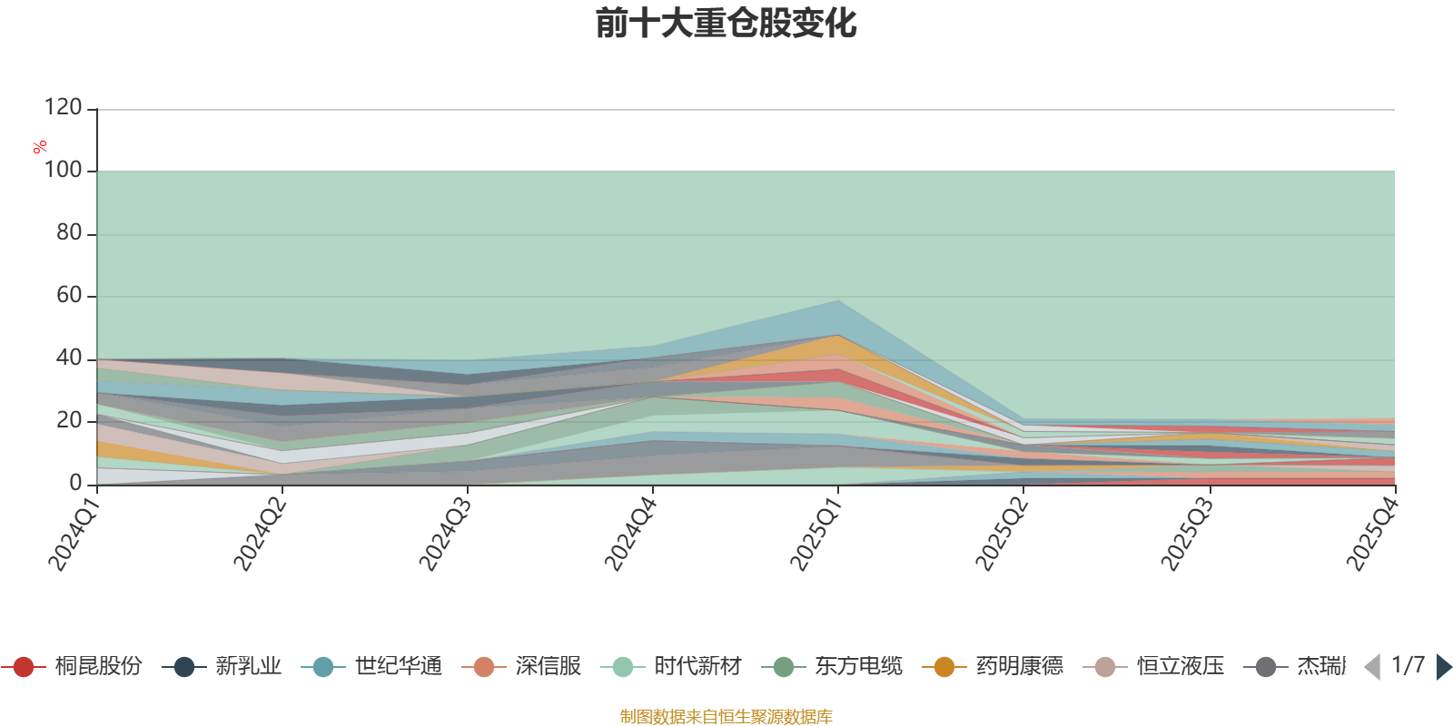 截至2025年末,基金十大重仓股分别是浙江荣泰、金风科技、中国中免、紫金矿业、合合信息、深信服、苑东生物、恒立液压、桐昆股份、思源电气。