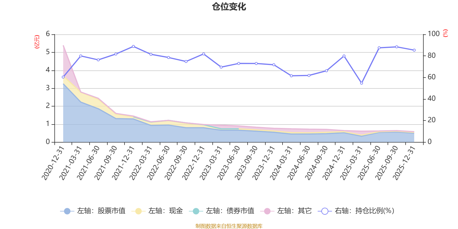 据定期报告数据统计,近三年平均股票仓位为72.74%,同类平均为72.57%。2021年末基金达到88.8%的最高仓位,2025年一季度末最低,为54.71%。