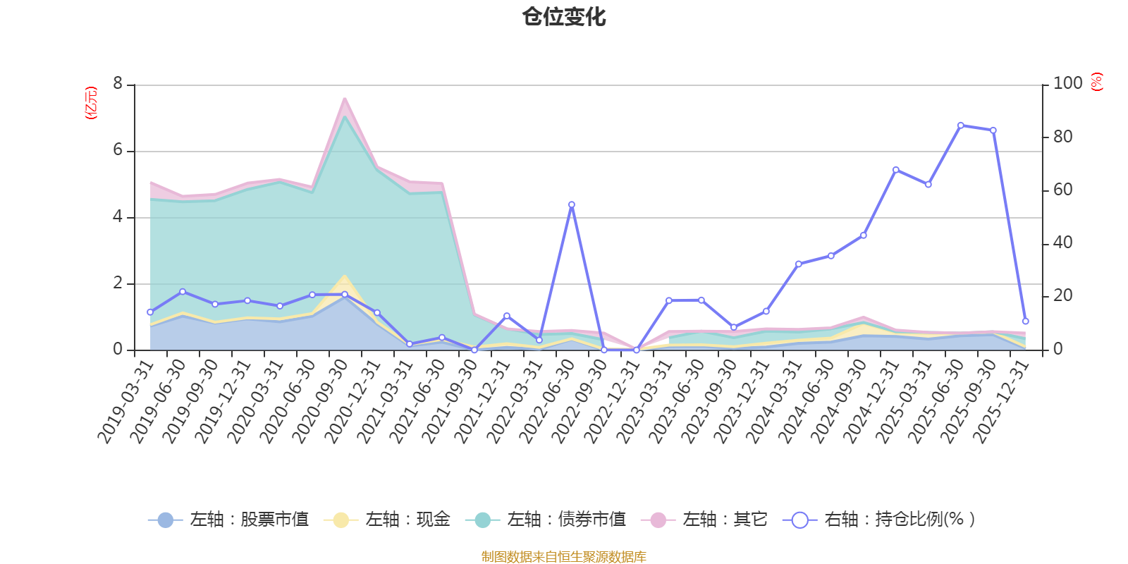 据定期报告数据统计,近三年平均股票仓位为40.03%,同类平均为72.57%。2025年上半年末基金达到84.64%的最高仓位,2021年三季度末最低,为0.03%。