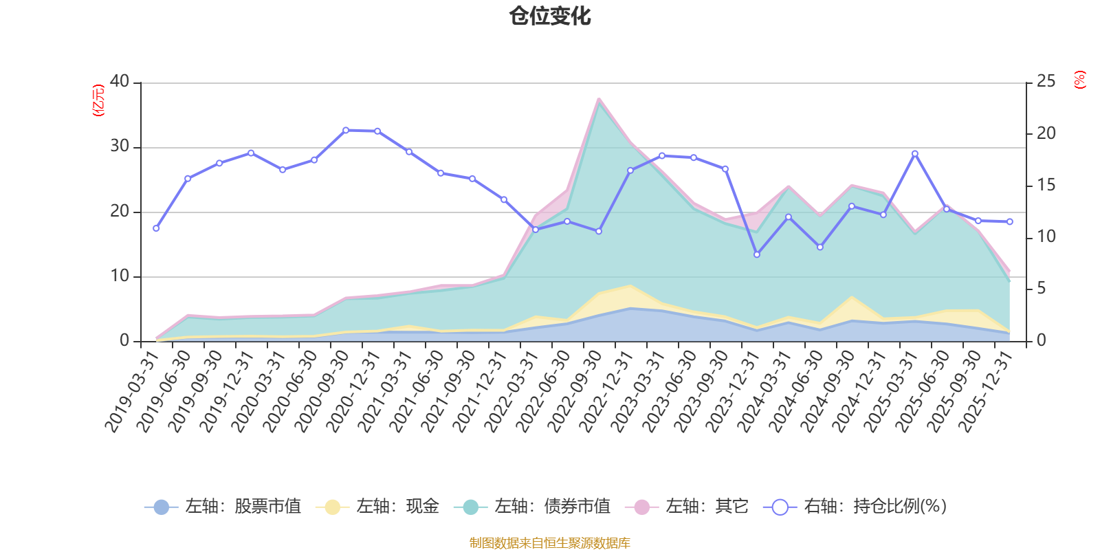 据定期报告数据统计,近三年平均股票仓位为13.44%,同类平均为19.2%。2020年三季度末基金达到20.39%的最高仓位,2023年末最低,为8.38%。
