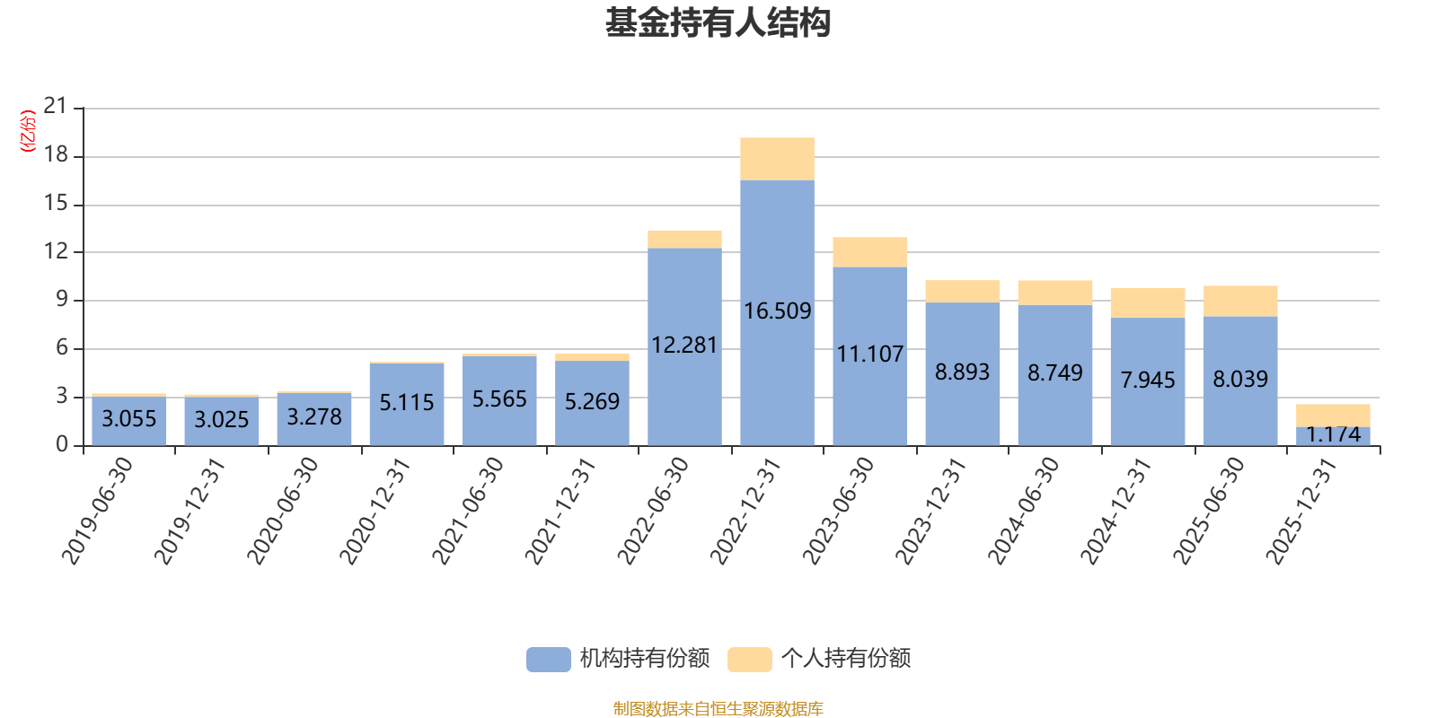 截至2025年12月31日,基金持有人共计51.2万户,合计持有2.57亿份。其中管理人员工持有55.69万份,占比0.22%,机构持有份额占比45.72%,个人投资者占比54.28%。