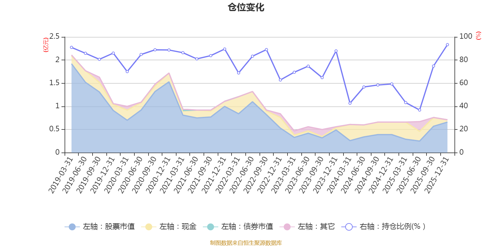 据定期报告数据统计,近三年平均股票仓位为63.54%,同类平均为72.57%。2025年末基金达到93.3%的最高仓位,2025年上半年末最低,为36.86%。