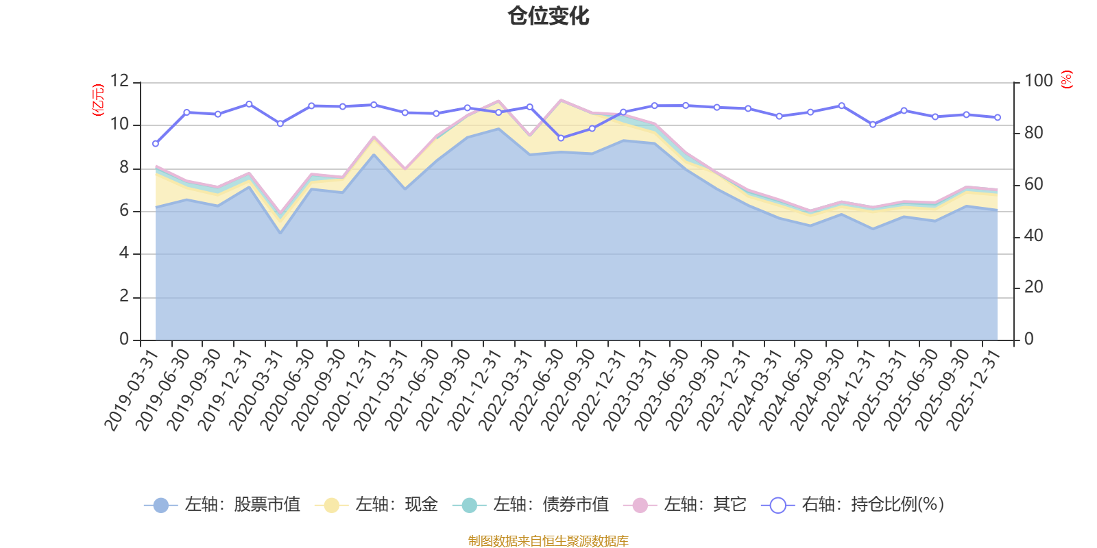 据定期报告数据统计,近三年平均股票仓位为88.43%,同类平均为72.57%。2019年末基金达到91.52%的最高仓位,2019年一季度末最低,为76.19%。