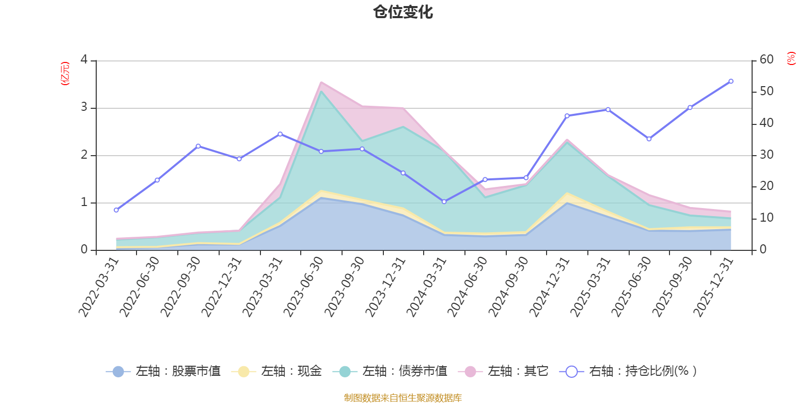 据定期报告数据统计,近三年平均股票仓位为33.8%,同类平均为19.2%。2025年末基金达到53.43%的最高仓位,2022年一季度末最低,为12.68%。