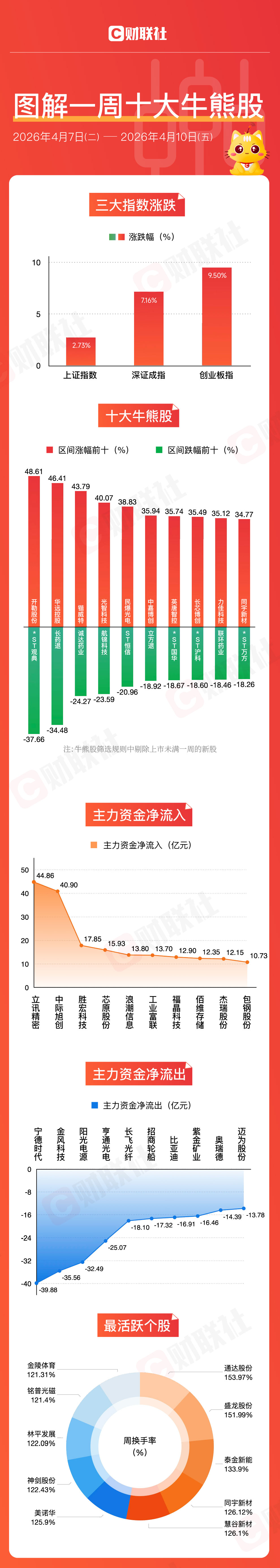 财联社4月12日讯,本周A股三大指数反弹拉升,其中上证指数周涨2.73%,深成指周涨7.16%,创业板指周涨9.60%。本周半导体、消费电子板块涨幅居前,CPO、电子化学品概念股表现活跃。