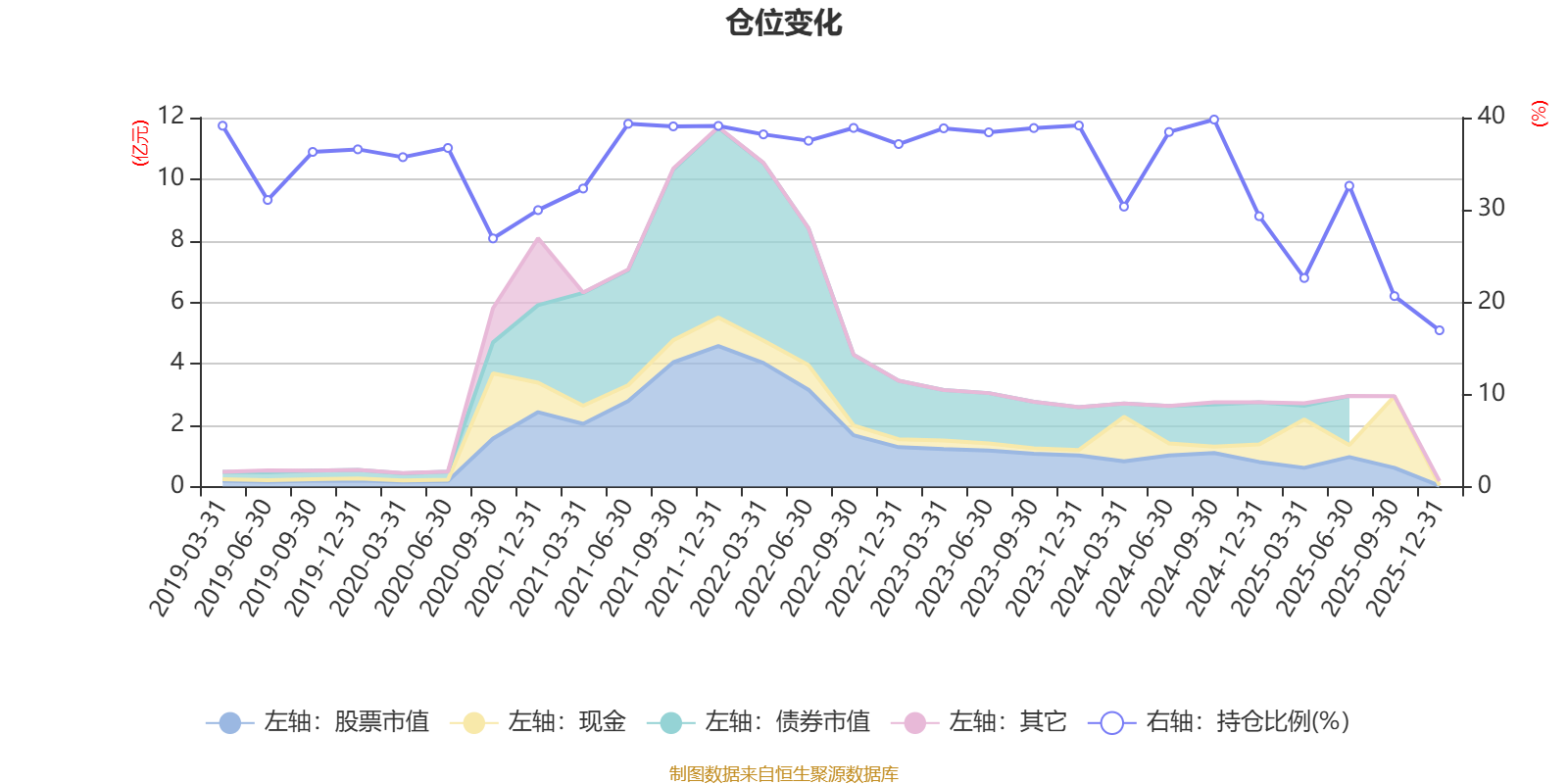 据定期报告数据统计,近三年平均股票仓位为32.16%,同类平均为19.2%。2024年三季度末基金达到39.79%的最高仓位,2025年末最低,为16.94%。
