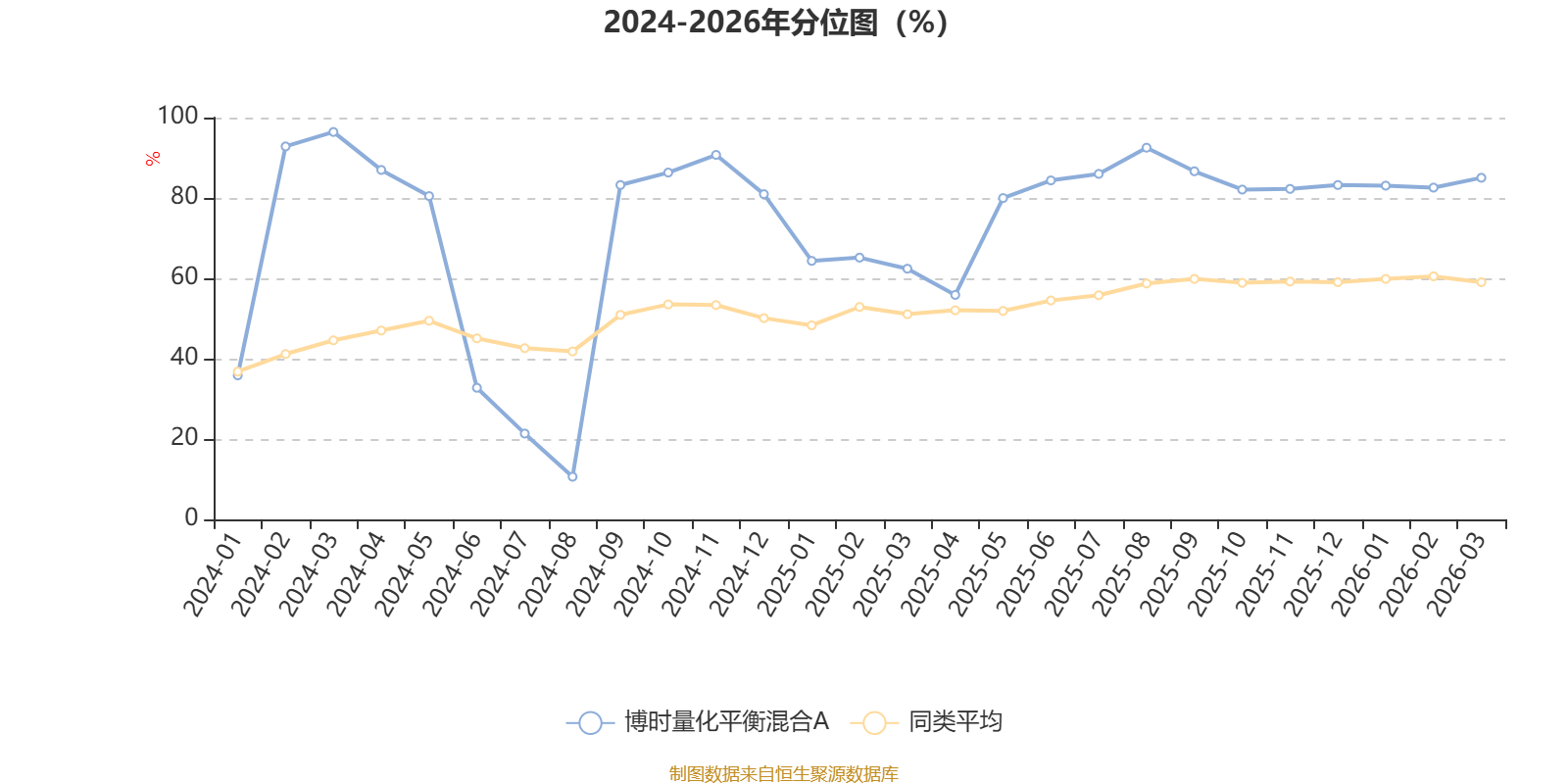 通过所选区间该基金净值增长率分位图,可以观察该基金与同类基金业绩比较情况。图为坐标原点到区间内某时点的净值增长率在同类基金中的分位数。