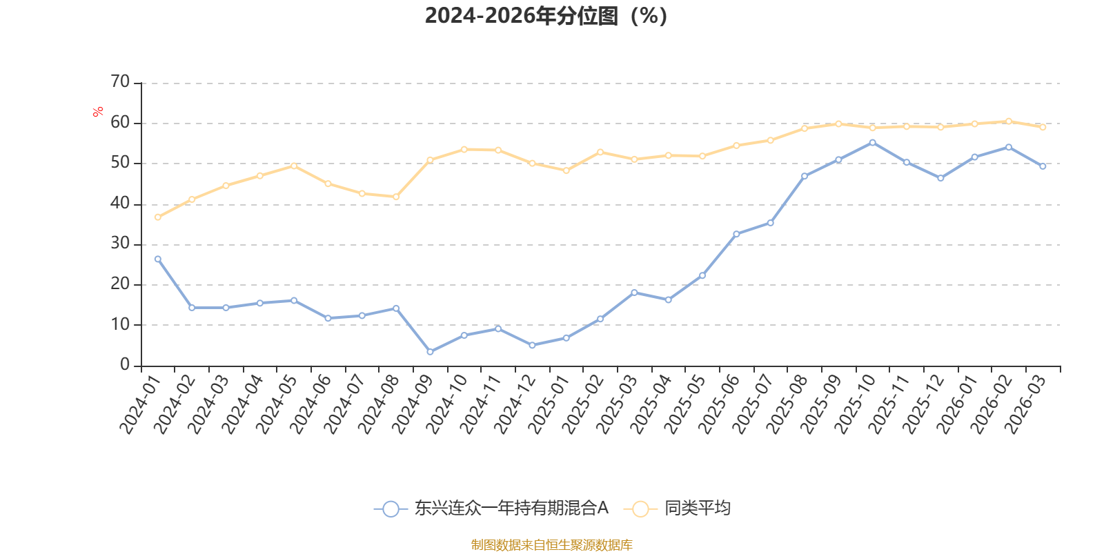 通过所选区间该基金净值增长率分位图,可以观察该基金与同类基金业绩比较情况。图为坐标原点到区间内某时点的净值增长率在同类基金中的分位数。